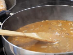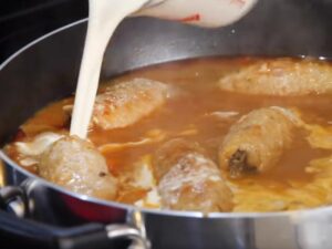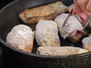 Tak przygotowane roladki obtaczamy w mące i smażymy na rozgrzanej patelni na śliczny, złoty kolor. Gotowe roladki odkładamy na talerz. Na patelni lub specjalnym garnku do sosów smażymy wcześniej posiekaną resztę cebuli wraz zresztą mąki. Do podsmażonej cebuli dodajemy śmietankę, i paprykę mieloną.