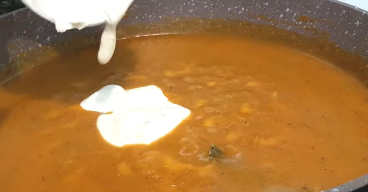Pamiętaj, aby cały czas mieszać masę na patelni. Dopraw do smaku przyprawami. Na końcu wszystko starannie wymieszaj, wlej śmietanę i ponownie rozmieszaj. Pilnuj, żeby nie powstały grudki. Gotowe.