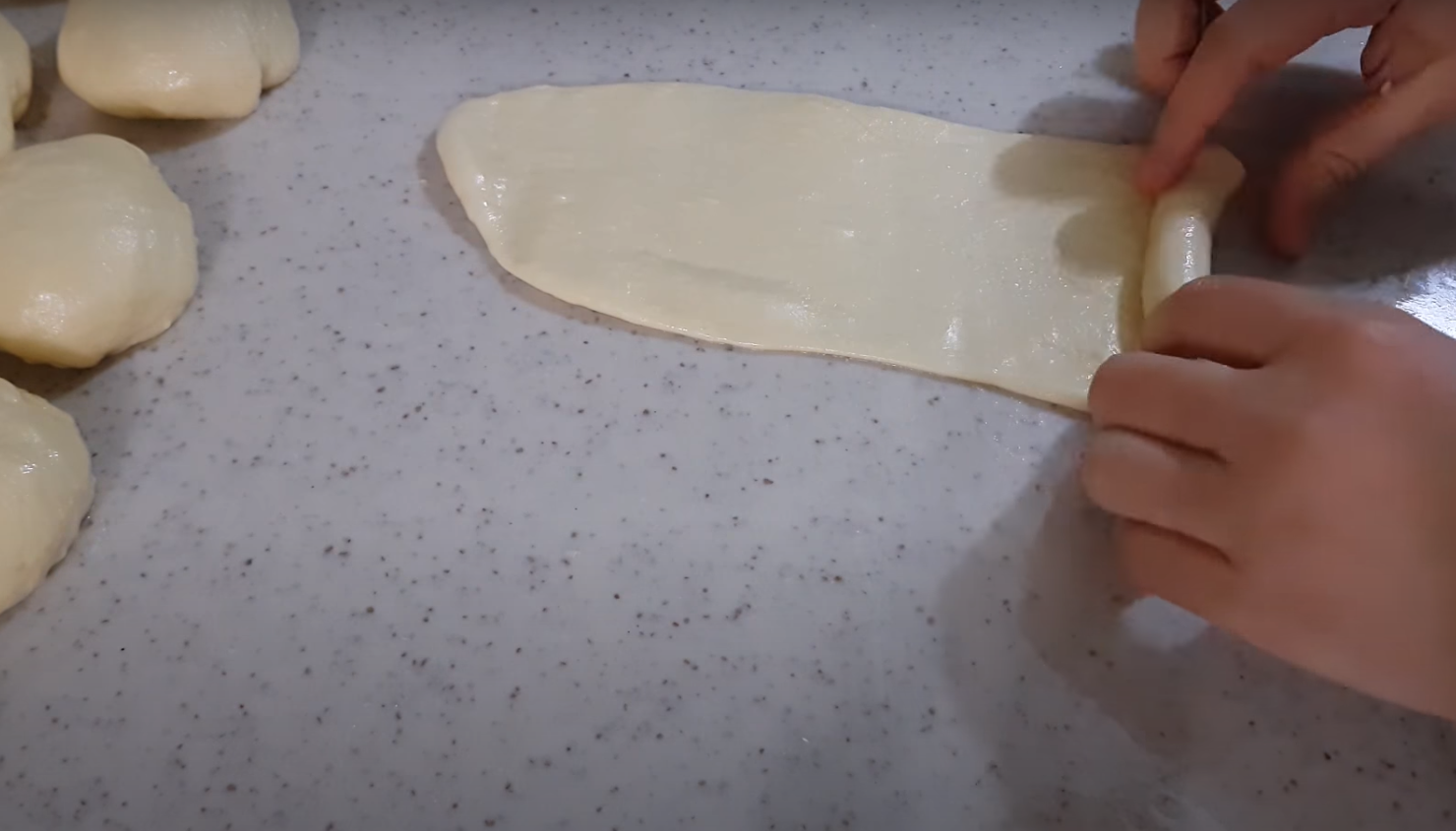 Na końcu dodaj mąkę oraz sól i zmieszaj wszystkie składniki na gładką masę. Odłóż ciasto na około 90 minut. Po tym czasie przygotuj blat smarując go olejem. Z ciasta uformuj 10 równych kulek, które następnie wałkuj do momentu powstania owalu. Tak przygotowane ciasto zwiń w rolkę.