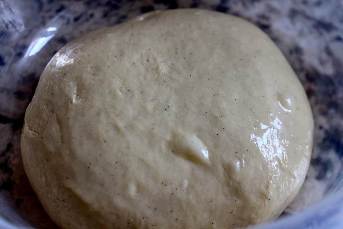 W momencie, gdy wyczuwalne będą grudki dolej jeszcze 20 ml oleju i wyrabiaj ciasto przez kolejne 10 minut. Powinno być odpowiednio miękkie i delikatnie lepić się do stolnicy. Tak przygotowane ciasto zawiń w folię spożywczą, umieść w misce i odłóż w ciepłe miejsce na czas 40 minut.