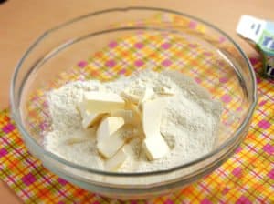 Na początek do miski należy wsypać 200 g przesianej przez sitko mąki i dodać do niej posiekane masło. Następnie całość należy wymieszać za pomocą ręki.