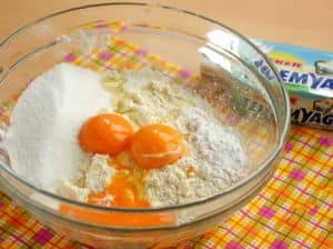 Do lekko wymieszanego ciasta należy dodać cukier, proszek do pieczenia oraz żółtka. Całość trzeba wymieszać i dodać pozostałą mąkę.