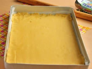 Ciasto należy rozwałkować, nawinąć na wałek i rozłożyć na spód przygotowanej formy. Następnie ciasto należy rozprowadzić równomiernie na całej długości i szerokości formy jednocześnie lekko dociskając brzegi ciasta palcami.