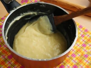 Następnie należy wziąć garnek wymieszać w nim cukier, mąkę, skrobię, żółtko i cukier waniliowy w mleku. Zawartość garnka należy wymieszać i ugotować.
