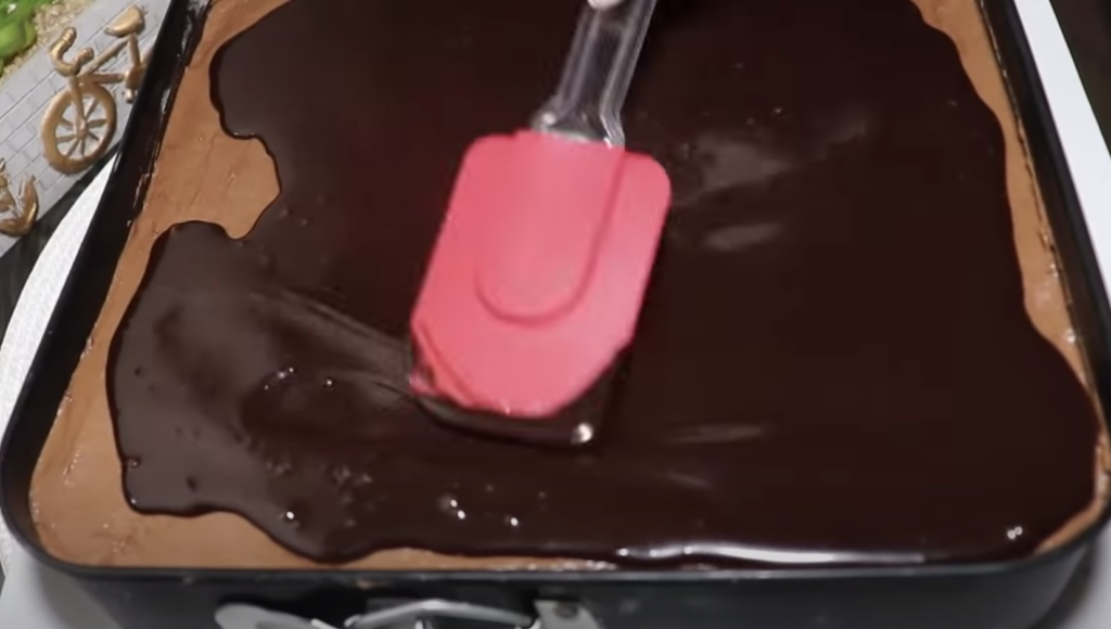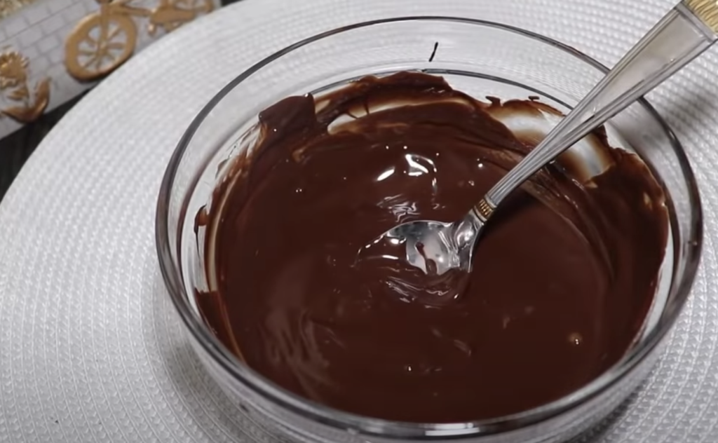 Gdy ciasto się piecze, przystępujemy do kolejnego kroku. Do naczynia przelewamy śmietankę, dodajemy czekoladę, wkładamy na gaz i delikatnie mieszając, doprowadzamy na małym ogniu do wrzenia. Gotujemy tak długo, aż lukier zgęstnieje.