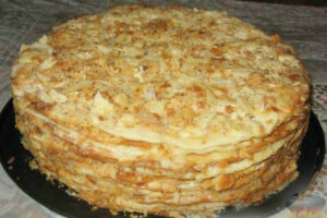 Gotowe „naleśniczki” ułóż w formę tortu. Każdy z nich z osobna posmaruj kremem. Pozostałą częścią masy oblej naszego „Napoleona” od góry Zmiel orzechy za pomocą blendera Posyp nimi gotowe ciasto
