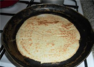 Ciasto podziel na kulki (mi zazwyczaj wychodzi 13-15) Rozwałkuj każdą kulkę z osobna Tak powstałe „naleśniki” usmaż na patelni (Uwaga! Na sucho! Nie dodawaj tłuszczu!) Brzegi placków warto wyrównać za pomocą głębokiego talerza (przykładamy do góry nogami i przycinamy)