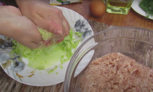 Myjemy cukinię i trzemy na tarce o dużych oczkach. Kolejno, odciskamy z niej nadmiar wody i dokładnie mieszamy z mięsem.