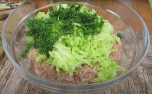 Drobno siekamy pęczek koperku i dodajemy go do mieszanki mięsa i cukinii. Wszystkie składniki ze sobą łączymy, następnie dodajemy jajko i dokładnie mieszamy.