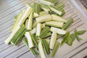 Przed rozpoczęciem pracy, warto najpierw przygotować 4 litrowe słoiki, należy dokładnie je umyć i wytrzeć do sucha. Następnie czas na cukinie, warzywo umyj pod bieżącą wodą i pokrój w słupki o szerokości ok. 8cm. Można także podzielić ją na paski, warto mieć na uwadze, że kawałki muszą zmieścić się do słoika.