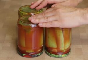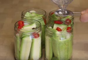 Każdy słoik wypełnij ciasno kawałkami cukinii, dodaj ząbek czosnku, gałązkę koperku, po 1 liściu wiśni i porzeczki, 3 ziarna ziela angielskiego i 1/4 posiekanej papryczki chili. Całość zalej wrzątkiem i odstaw na 10 minut.