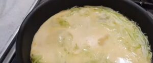 Wrzuć na patelnię połowę startej cukinii. Podsmaż z cebulą około 4 minuty. Resztę cukinii wymieszaj w misce z jajkami i przyprawami.