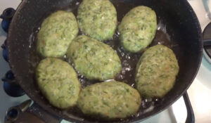 Kiedy kotlety będą już zarumienione – przykryj je pokrywką i smaż jeszcze przez 1,5 – 2 minut. Następnie odwróć je, przykryj ponownie i smaż przez kolejne 3 minuty. Gotowe placki ułóż na papierowych ręcznikach, aby odsączyć nadmiar tłuszczu.