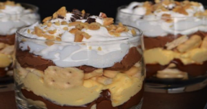 4. Kolejną warstwą jest wcześniej przygotowany krem, po czym przykryj go ponownie pokruszonymi herbatnikami.