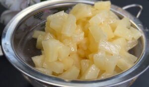 Otwórz puszki z ananasem i za pomocą sitka odsącz sok z zalewy. Nie wylewaj syropu, ponieważ wykorzystasz go później w tym przepisie.