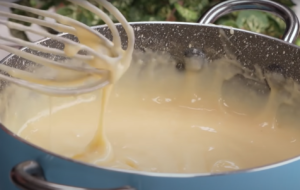 Za pomocą trzepaczki połączyć ze sobą mąkę, cukier, cukier wanilinowy oraz jajka. Do garnuszka z mlekiem dodać przygotowaną mieszankę.