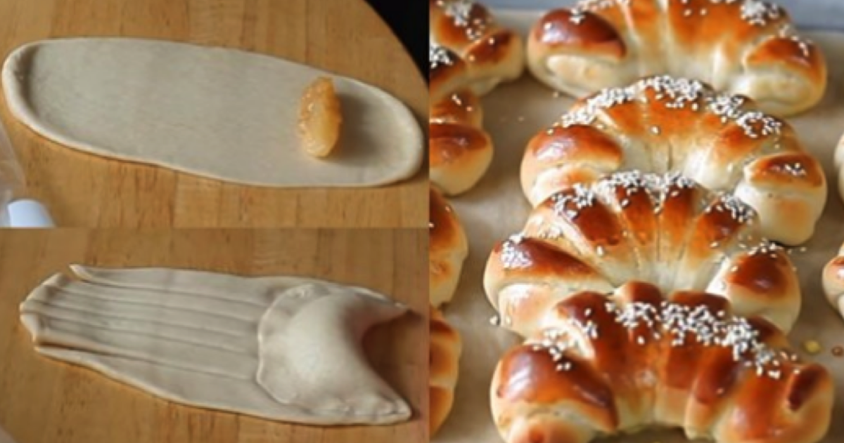 Pozostałą rozwałkowaną część podziel na 4 paski i oplataj nimi zawiniętą część z dżemem lub kremem. Tak uformuj kształt rogalików.