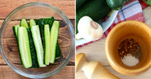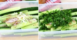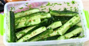 Umyj ogórki przed pokrojeniem ich na równe kawałki. Następnie przenieś je do pudełka. Konieczne będzie przykrycie ogórków odpowiednią pokrywą. Pokrojone paski doprawić resztą składników i rozgniecionym czosnkiem.