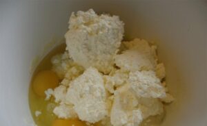3. Do przygotowanej mieszanki dodaj twaróg, który wcześniej rozłóż na mniejsze kawałki.