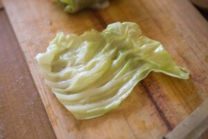 W dużym garnku zagotowujemy wodę, doprawiamy ją solą. Wkładamy do garnka główkę kapusty i gotujemy ją przez 3 minuty. Wyjmujemy kapustę, odkładamy ją na bok i czekamy aż ostygnie. W tym czasie przygotowujemy ciasto.