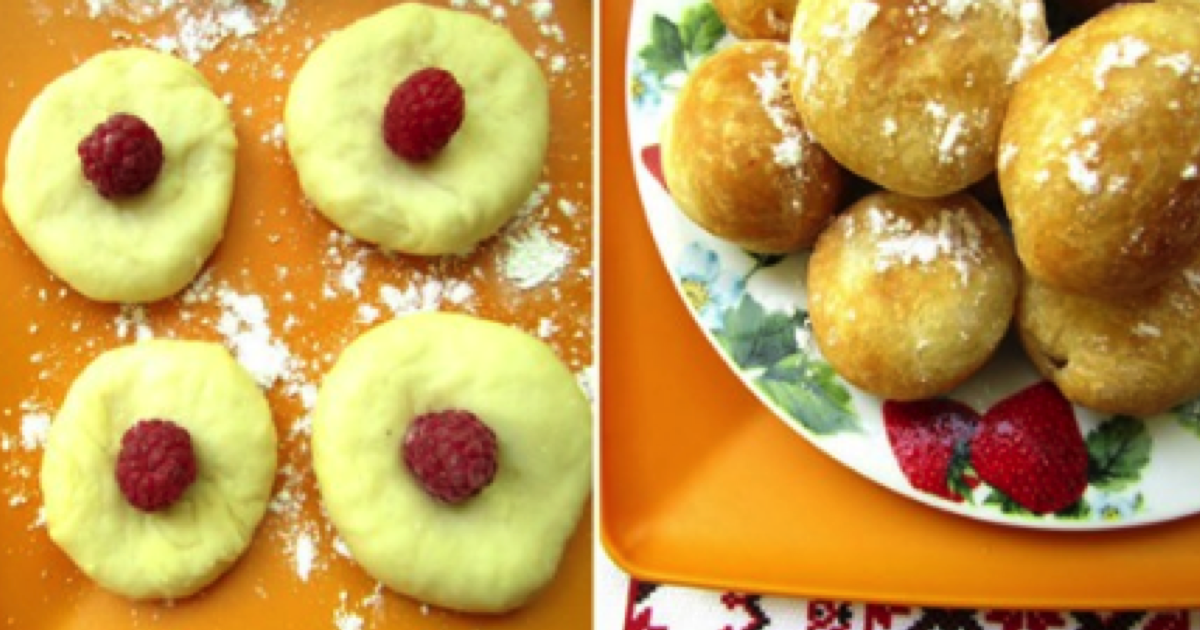 Mąkę przesiewamy i dodajemy proszek do pieczenia. Następnie zagniatamy ciasto, nie powinno ono kleić się nam do rąk. Ciasto wałkujemy tworząc roladkę. Kroimy na kawałki formując płaskie krążki. Na środku każdego krążka umieszczamy maliny, łączymy krawędzie i tworzymy kulkę.