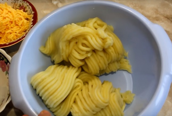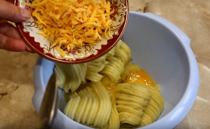 Ziemniaki przełóż do miski i wbij do nich jajko oraz dodaj cebulkę i starty na tarce o średnich oczkach ser. Całość porządnie wymieszaj.