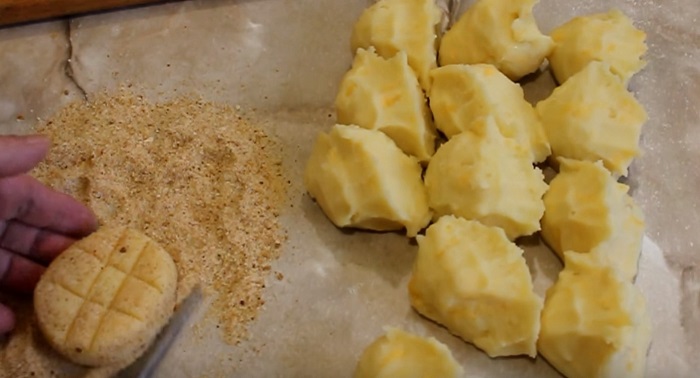 Z powstałego ciasta uformuj dłońmi niewielkie, zgrabne kotleciki i obtocz każdy w tartej bułce. Na każdym zrób nożem kilka płytkich nacięć w kratkę.