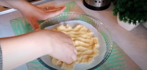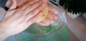 Połącz wszystkie składniki, aż uzyskasz gładkie ciasto. Po uzyskaniu gładkiego ciasta, pokrój je na dwie części, zawiń folią cling i zamroź przez 30 minut.