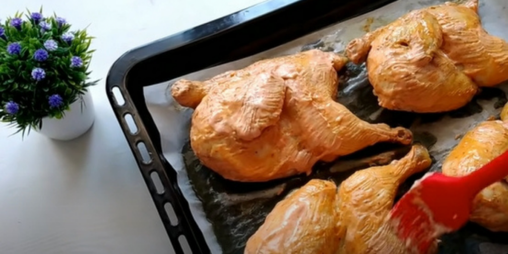 Poczekaj aż skórka zacznie się rumienić. Po tym czasie kurczaka wyjmij na chwilę z piekarnika. Majonez wymieszaj z koncentratem pomidorowym i dokładnie wetrzyj w kurczaka.