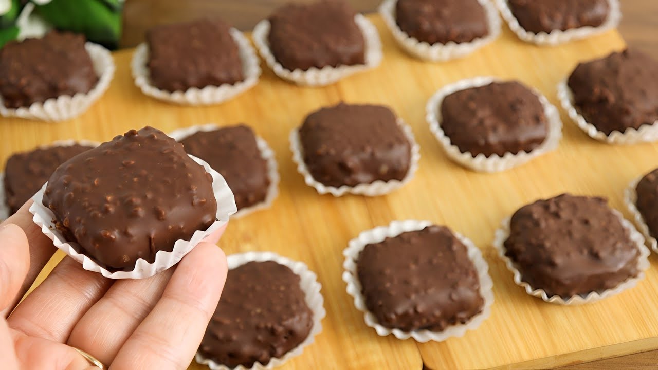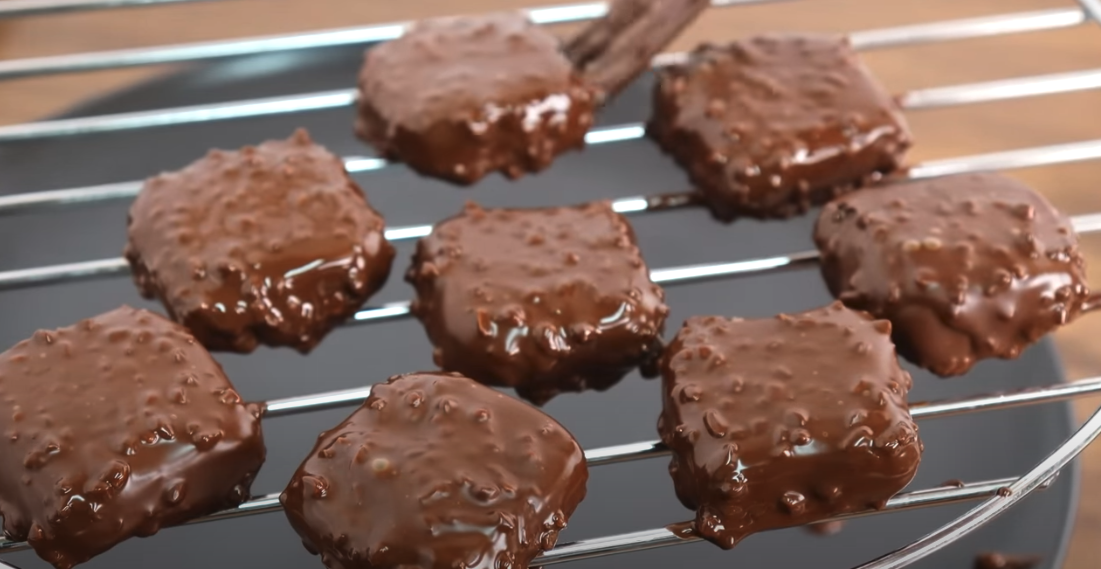 Wyjmij kwadraty z zamrażarki. Zanurz każdy kwadrat w roztopionej czekoladzie, a następnie posyp posiekanymi orzechami laskowymi. Włóż do lodówki na 5 minut, aby czekolada stwardniała.