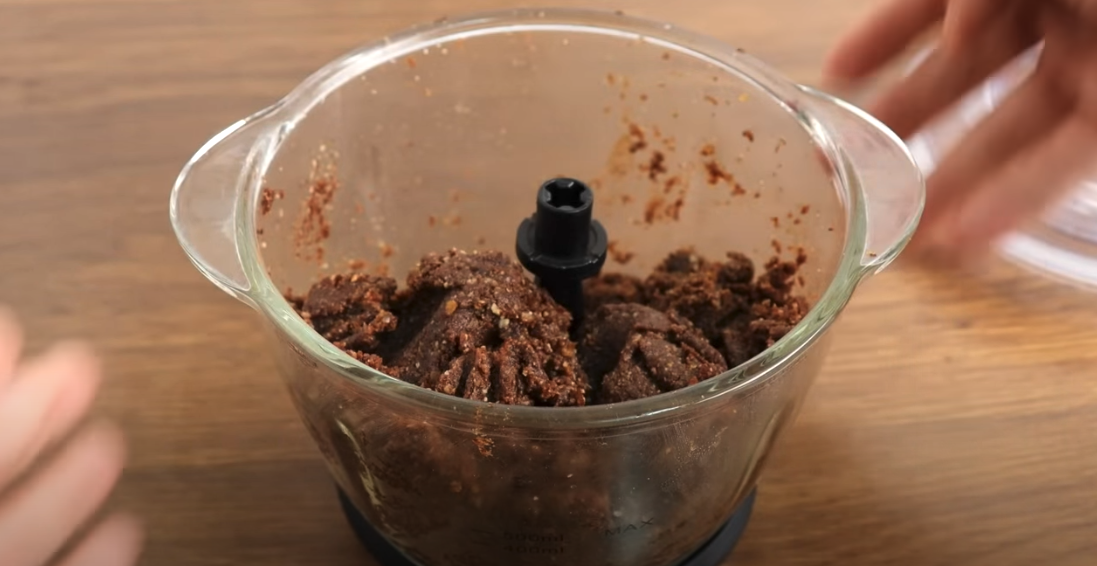 Moczyć daktyle w ciepłej wodzie przez 10 minut. Dobrze umyć i usunąć pestki. W blenderze lub procesorze kuchennym zmielić prażone orzechy laskowe, wiórki kokosowe, kawę rozpuszczalną (jeśli używasz), wodę, sól i kakao w proszku, aż uzyskasz jednolitą masę. Dodaj namoczone daktyle do mieszanki i blenduj, aż masa będzie gładka.