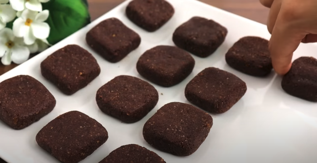 Dodaj miód lub melasę daktylową i ponownie dobrze wymieszaj. Wyłóż małe foremki papierowe na blachę. Uformuj mieszankę w kwadraty o żądanej wielkości i umieść je w foremkach. Włóż do zamrażarki na 15 minut. W międzyczasie, rozpuść gorzką czekoladę w kąpieli wodnej lub w kuchence mikrofalowej. Dodaj olej roślinny lub kokosowy i dobrze wymieszaj.