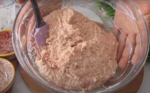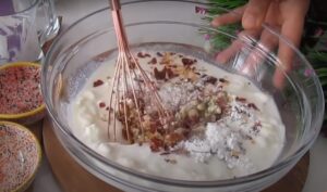 Do miski wlewamy jogurt i mleko, a następnie dobrze mieszamy. Do tego dodajemy mięso mielone, jajka, chilli (jeśli lubi się ostrzejsze smaki), czosnek przeciśnięty przez praskę, tymianek, sól i proszek do pieczenia.