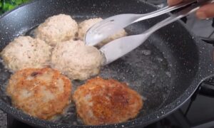 Z takiej masy tworzymy klopsy i smażymy na rozgrzanym oleju aż uzyskają złocisty kolor.