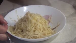 Ziemniaki ugotować na półtwardo. Po ich ostudzeniu, zetrzeć je na tarce o grubszych oczkach i przełożyć do większej miski. Następnie dodać do nich 1 łyżkę majonezu z dodatkiem soli oraz pieprzu.