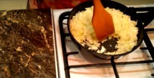 Wszystko razem dokładnie wymieszać do połączenia się składników. Cebulę obrać i drobniutko posiekać. Na patelni rozgrzać olej roślinny, a potem usmażyć na nim cebulę do uzyskania złotego koloru.
