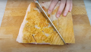 Zdejmij lub odkrój skórkę z mięsa. Natnij cały kawałek.