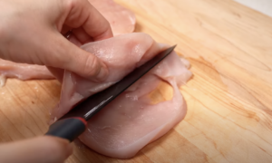 Na początku dokładnie myjemy i osuszamy pierś z kurczaka, oraz nacinamy ją wzdłuż (nie przekrajamy całkowicie!).