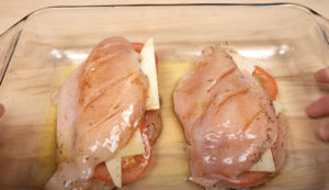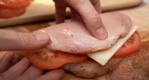 Na każdym kawałku piersi układamy po dwa plastry pomidora i sera, na końcu składamy pierś jak kanapkę.