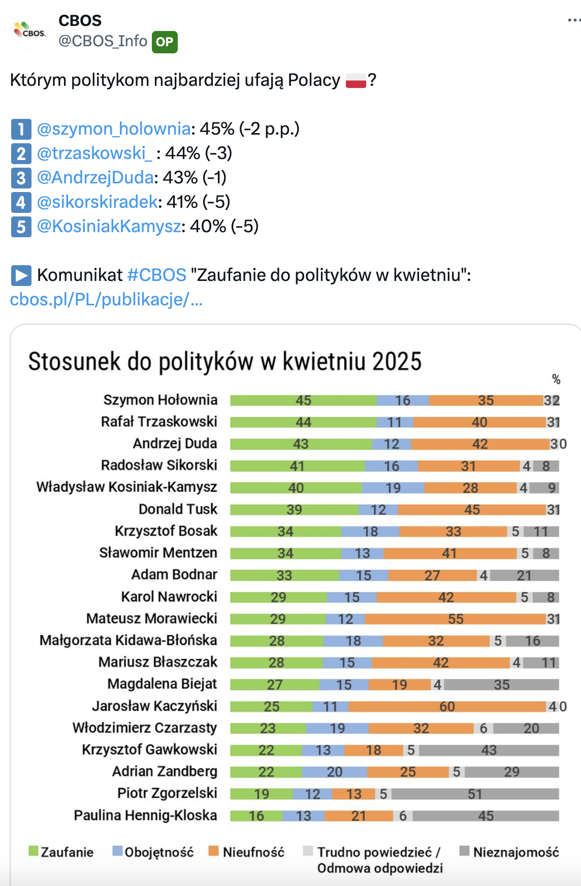 Wysokie wyniki zanotowali również Krzysztof Bosak i Sławomir Mentzen (po 34 proc.) oraz Adam Bodnar (33 proc.).