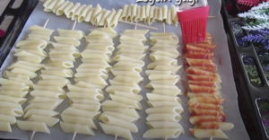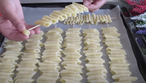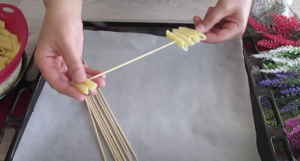 Ostudzony makaron nadziewamy na patyczki do szaszłyków.