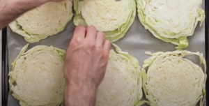 Blaszkę wykładamy papierem do pieczenia i układamy na niej plastry kapusty.
