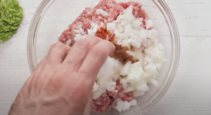 W jednej misce mieszamy mięso mielone, drobno posiekaną cebulę i wszystkie przyprawy.