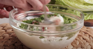 W osobnej miseczce mieszamy jogurt naturalny, koncentrat pomidorowy, pietruszkę i szczypiorek.