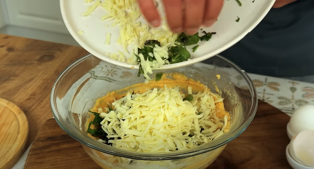 Zetrzyj ser na tarce. Drobno posiekaj zieleninę (pietruszkę, bazylię). Posiekaj czosnek. W misce rozbij jajka, dodaj mleko, szczyptę soli i ulubione przyprawy. Dodaj zieleninę i czosnek, dobrze wymieszaj. Dodaj mąkę ryżową, mąkę kukurydzianą i proszek do pieczenia.