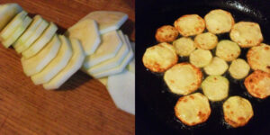 2. Na rozgrzanej patelni z dodatkiem oleju podsmaż cukinię na zloty kolor. Pamiętaj, aby smażyć z każdej strony. Aby usunąć nadmiar tłuszczu, koniecznie po usmażeniu kładź na ręczniku papierowym. Pozostaw na kilka minut.