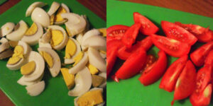 4. Umyte pomidory pokrój na ósemki, z jajkami postępuj tak samo jak z cukinia. Na mniejszą kosteczkę pokrój cebulę , następnie przeciśnij czosnek przez praskę i posiekaj natkę pietruszki, tak przygotowane składniki przełóż do miski z cukinią.