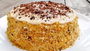 Usmażone duże placki układaj na talerzu. Za pomocą patery zacznij formować ciasto. Na sam dół połóż usmażony biszkopt, po czym posmaruj go wcześniej przygotowanym kremem, następnie posyp orzeszkami oraz śliwkami. Kolejne warstwy układaj tak samo. Na sam koniec górę biszkoptu oraz boki starannie posmaruj resztą kremu. Jako dekoracji możesz użyć orzeszków oraz roztopionej czekolady. Tak przygotowany deser przechowuj w lodówce około 4 godziny.