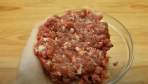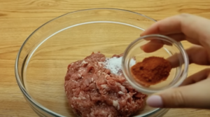 Zacznij od przygotowania mięsa. W misce wymieszaj dokładnie mięso z przyprawami: czarnym pieprzem, solą, czerwoną papryką oraz rozmarynem.