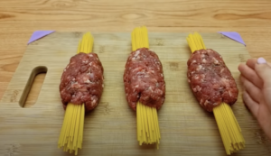 Przygotowany makaron podziel na trzy części, a następnie na środku każdej z nich uformuj mięso w kształt klopsika. Smaż je na rozgrzanym oleju przez 2/3 minuty z każdej strony.